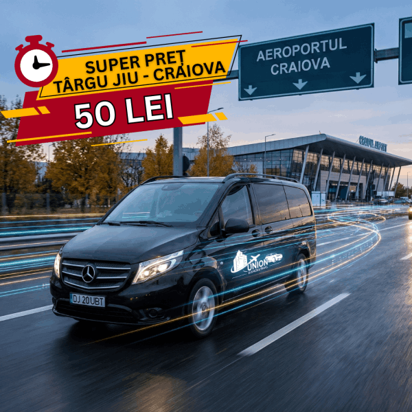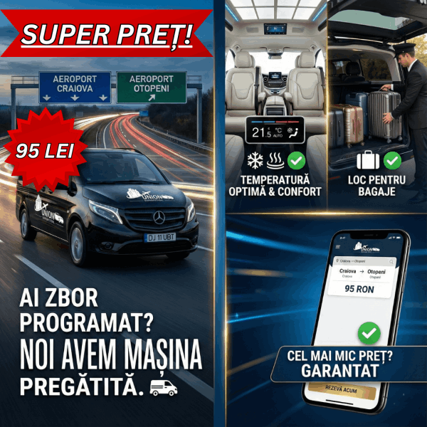 SuperPreț Craiova înseamnă tarif fix de 95 lei pentru ruta din Craiova către Aeroport Otopeni (Henri Coandă) sau Aeroport Băneasa.